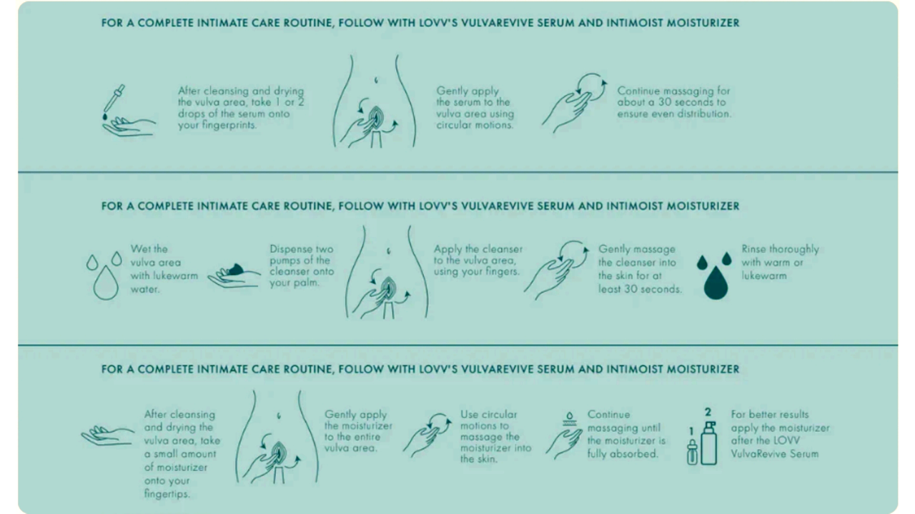 - Begin your intimate skincare routine by washing the vulva area with LOVV Intimate Cleanser. Pat dry with a clean towel.